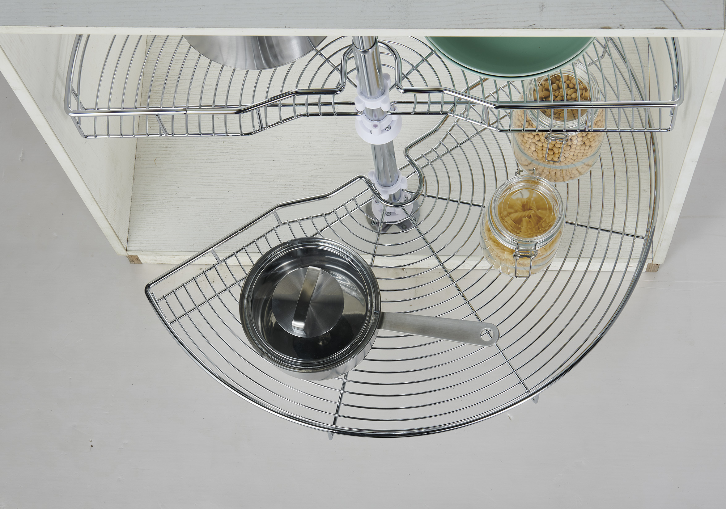 A 180 degree swivel basket rotates halfway outward, allowing easy access to cookware and kitchen essentials stored in corner cabinets.