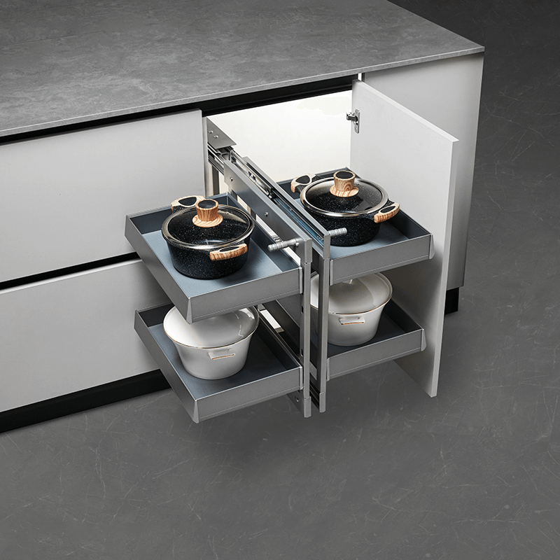Maximizes corner cabinet storage with a double-layer pull-out system.