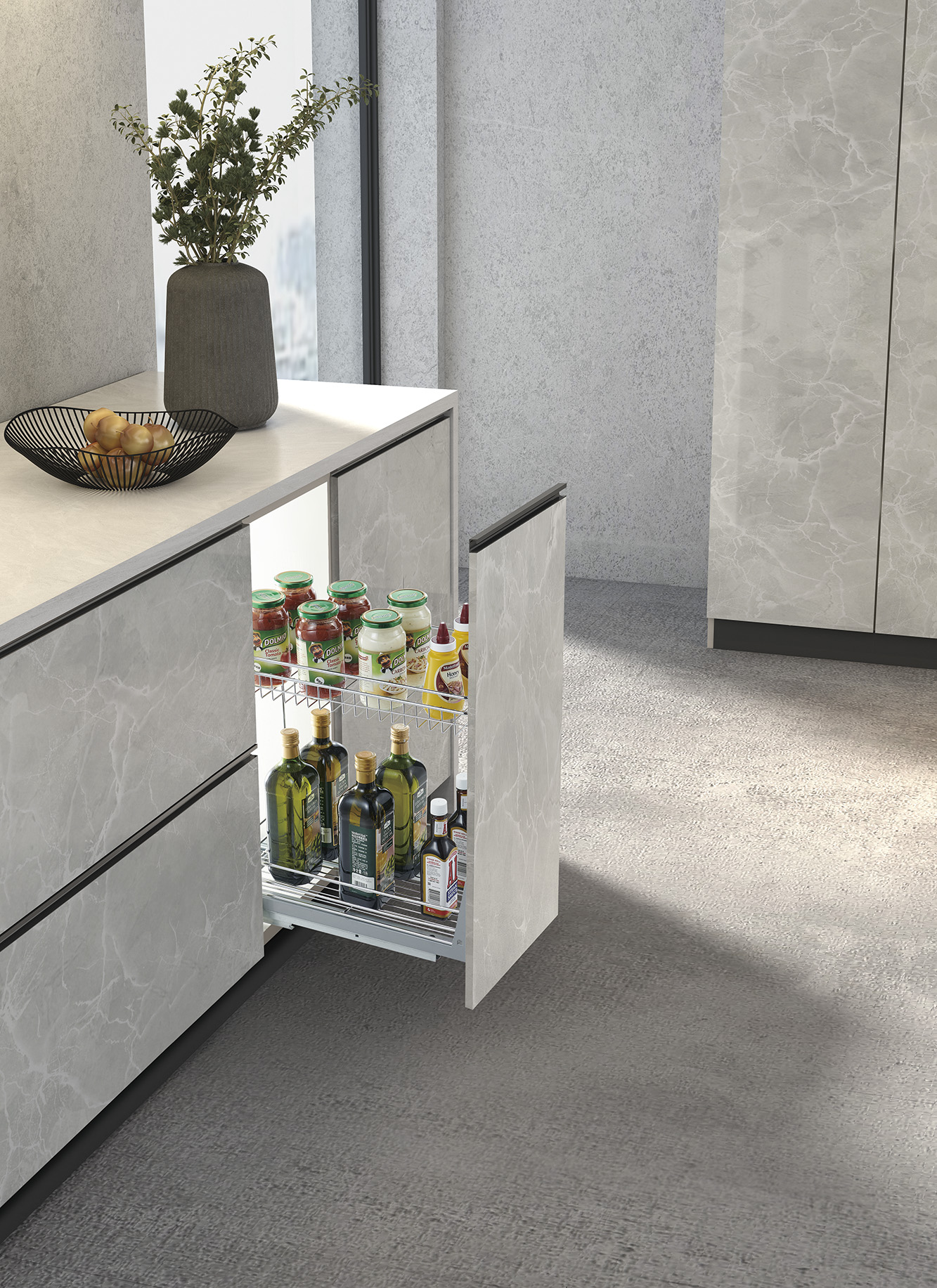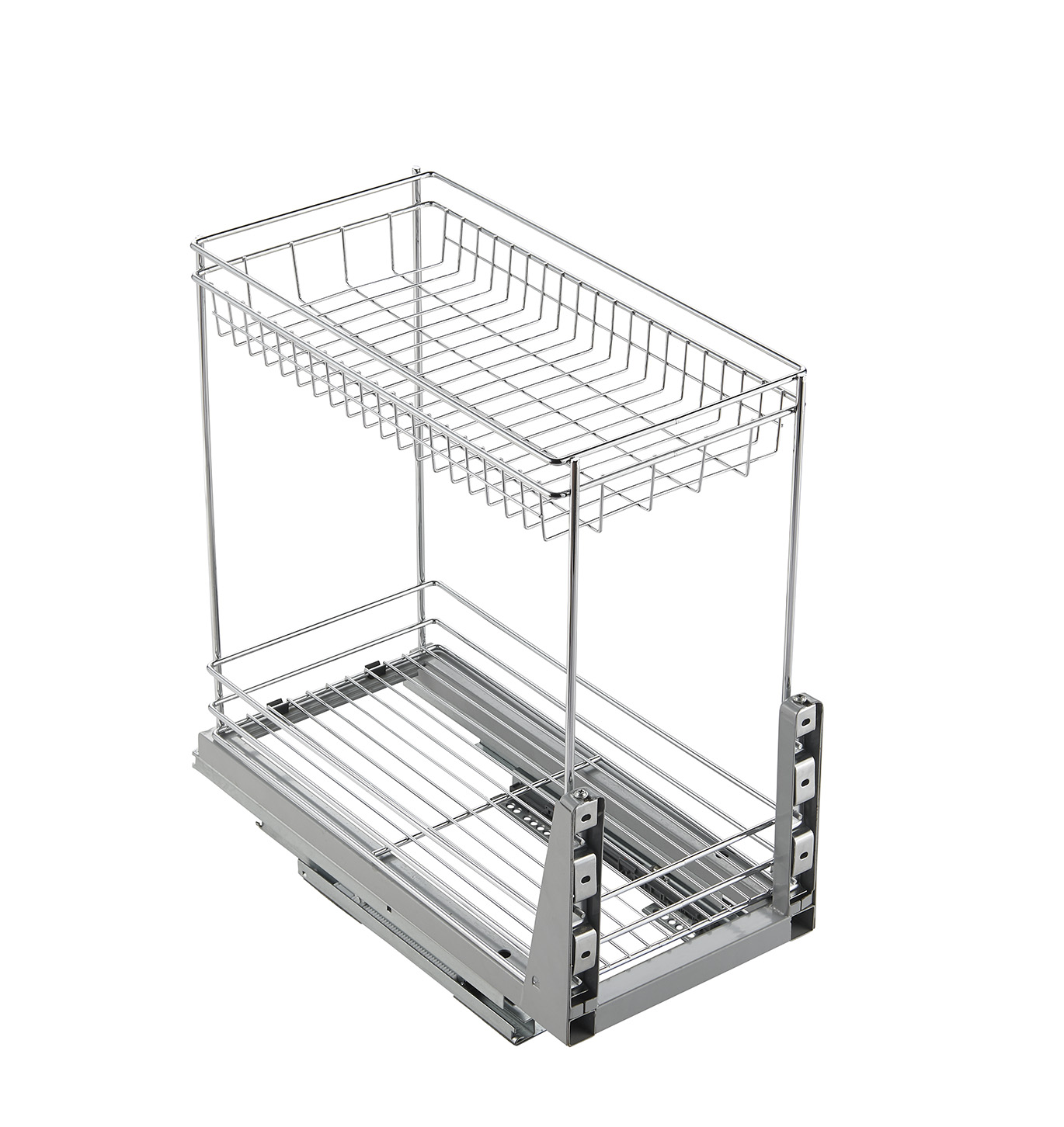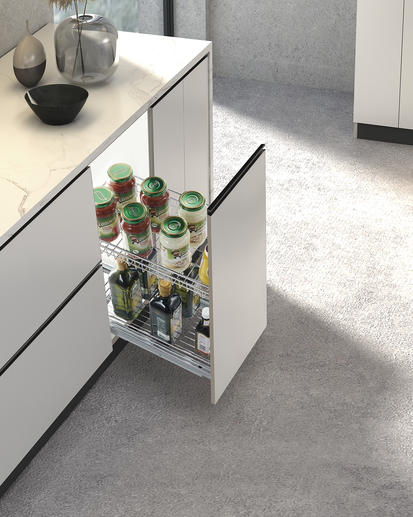 Ideal for cabinet manufacturers to upgrade narrow cabinet functionality with a practical two-tier pull-out storage system.
