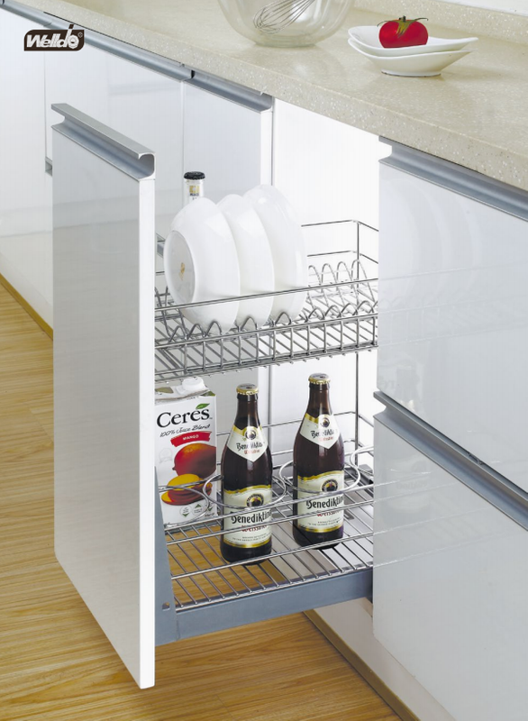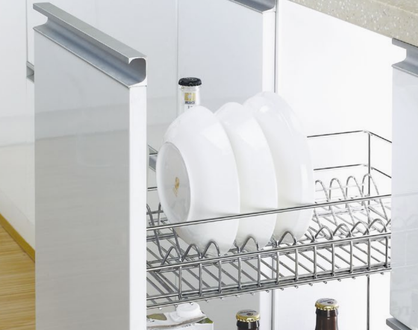 The pull-out drawer design provides full visibility of stored items, helping users access plates and bottles without bending deep into the cabinet. It also reduces wasted space and improves cabinet accessibility compared with fixed shelves. This is a strong selling point for cabinet manufacturers and project buyers who want practical, user-friendly kitchen storage hardware.