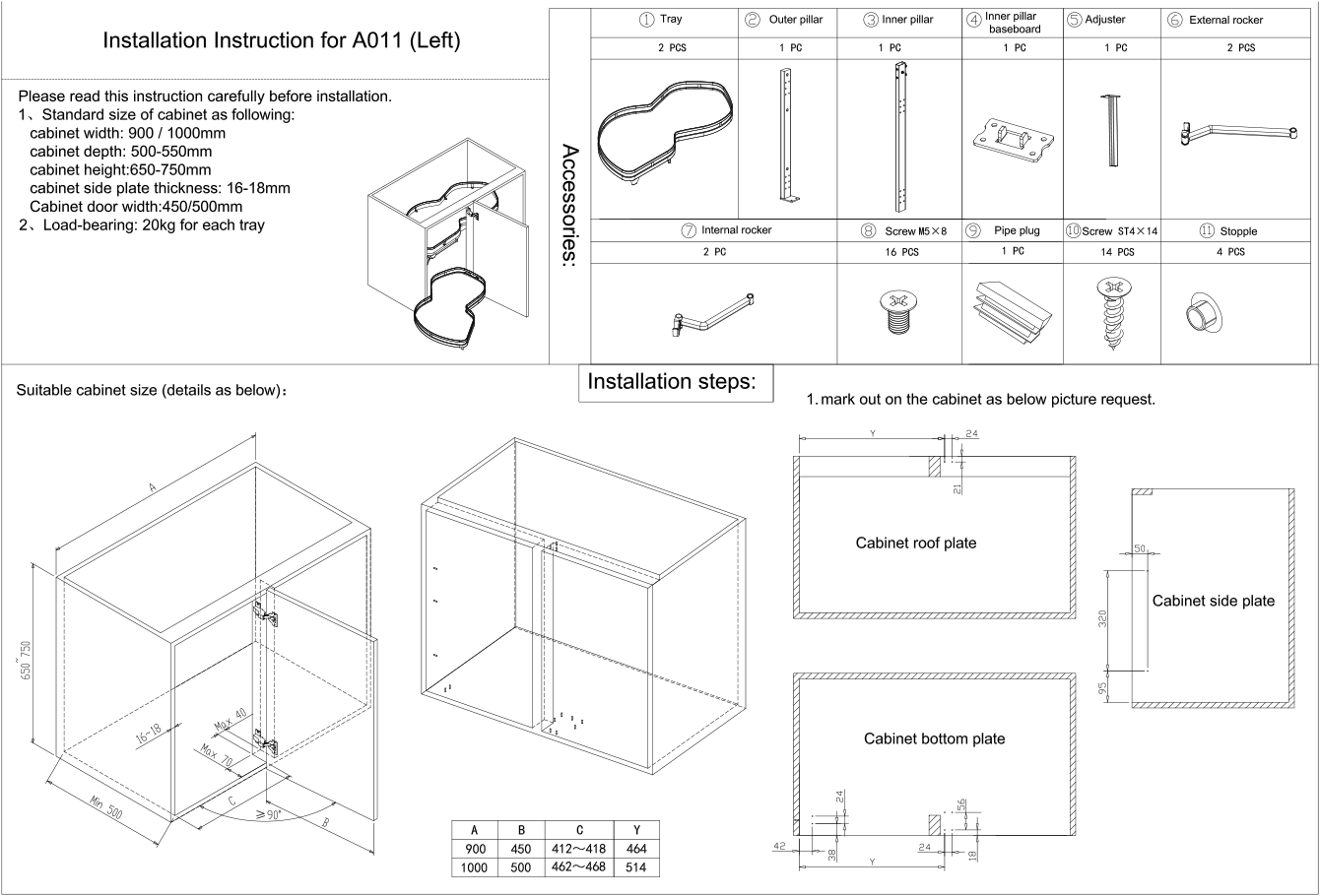 A: It fits cabinets with a width of 850-900mm, making it suitable for most standard L-shaped or corner kitchen cabinets.