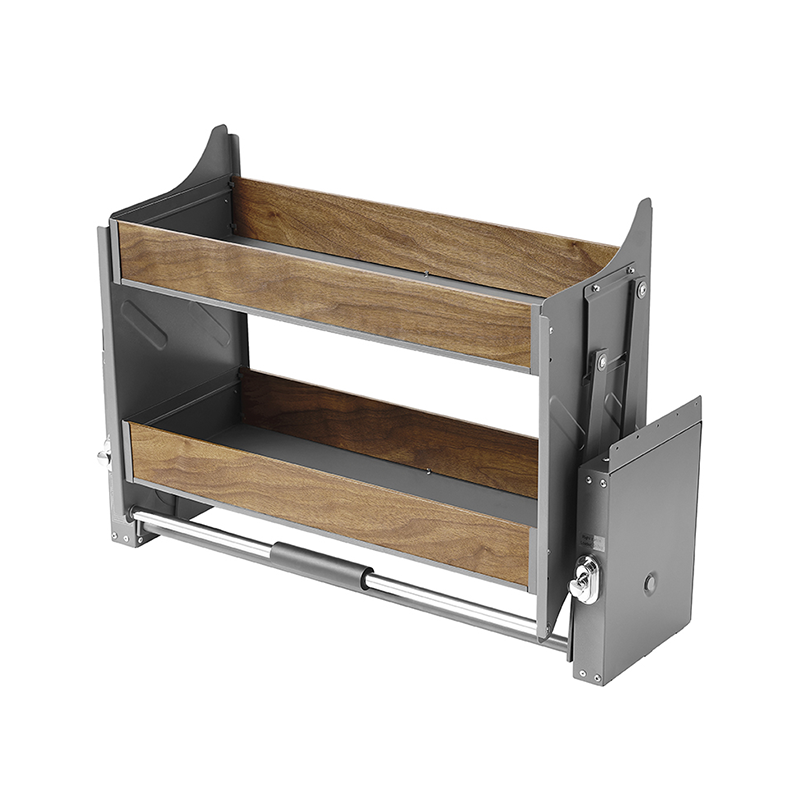 Open the cabinet door. Grasp the lower handle and pull gently - the air - pressure system lowers the basket smoothly (max load 15kg, distribute weight evenly). Push upward to reinsert securely into the cabinet. Clean the metal frame with a dry cloth and the wood shelves with a slightly damp cloth.
