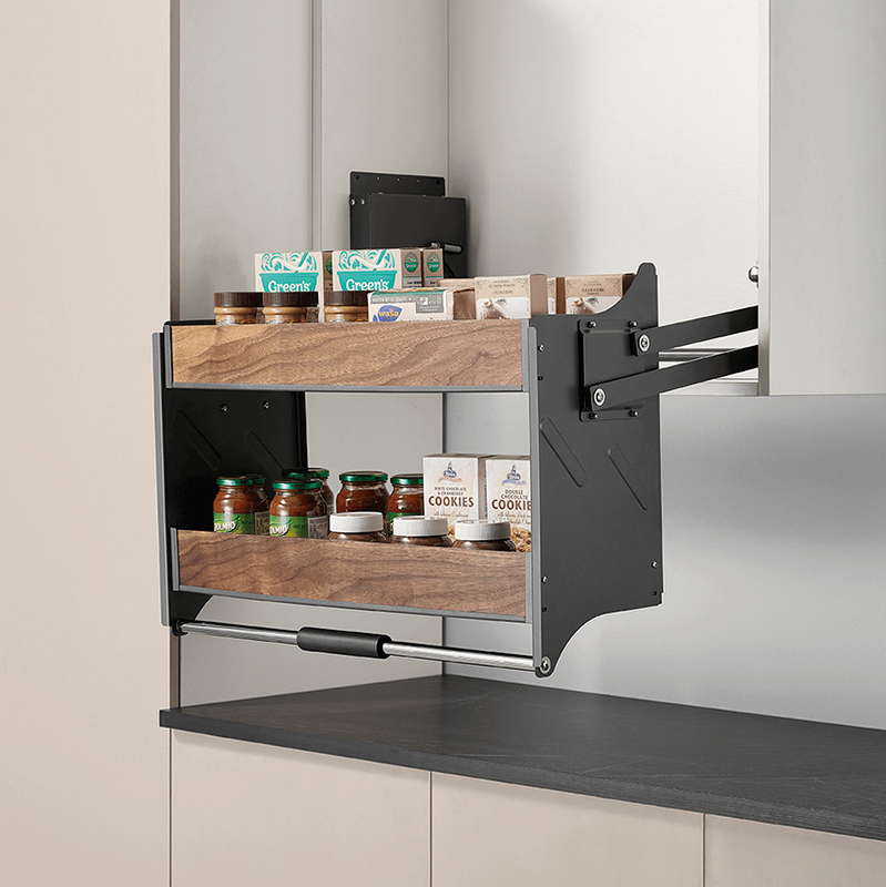 The 2-tier pull down basket makes full use of high or hard-to-reach wall cabinets, converting wasted vertical space into efficient storage. By smoothly lowering the rack to eye level, users can easily access bottles, jars, and condiments. This design improves accessibility by more than 60% compared with traditional fixed shelves, making it ideal for compact kitchens or tall cabinets.