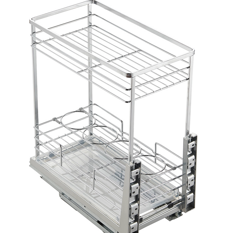 This 2-tier pull out spice basket is designed for narrow kitchen cabinets to organize bottles, condiments and pantry items efficiently. Featuring double-layer storage and soft close slides, it maximizes cabinet space while offering smooth pull-out access.