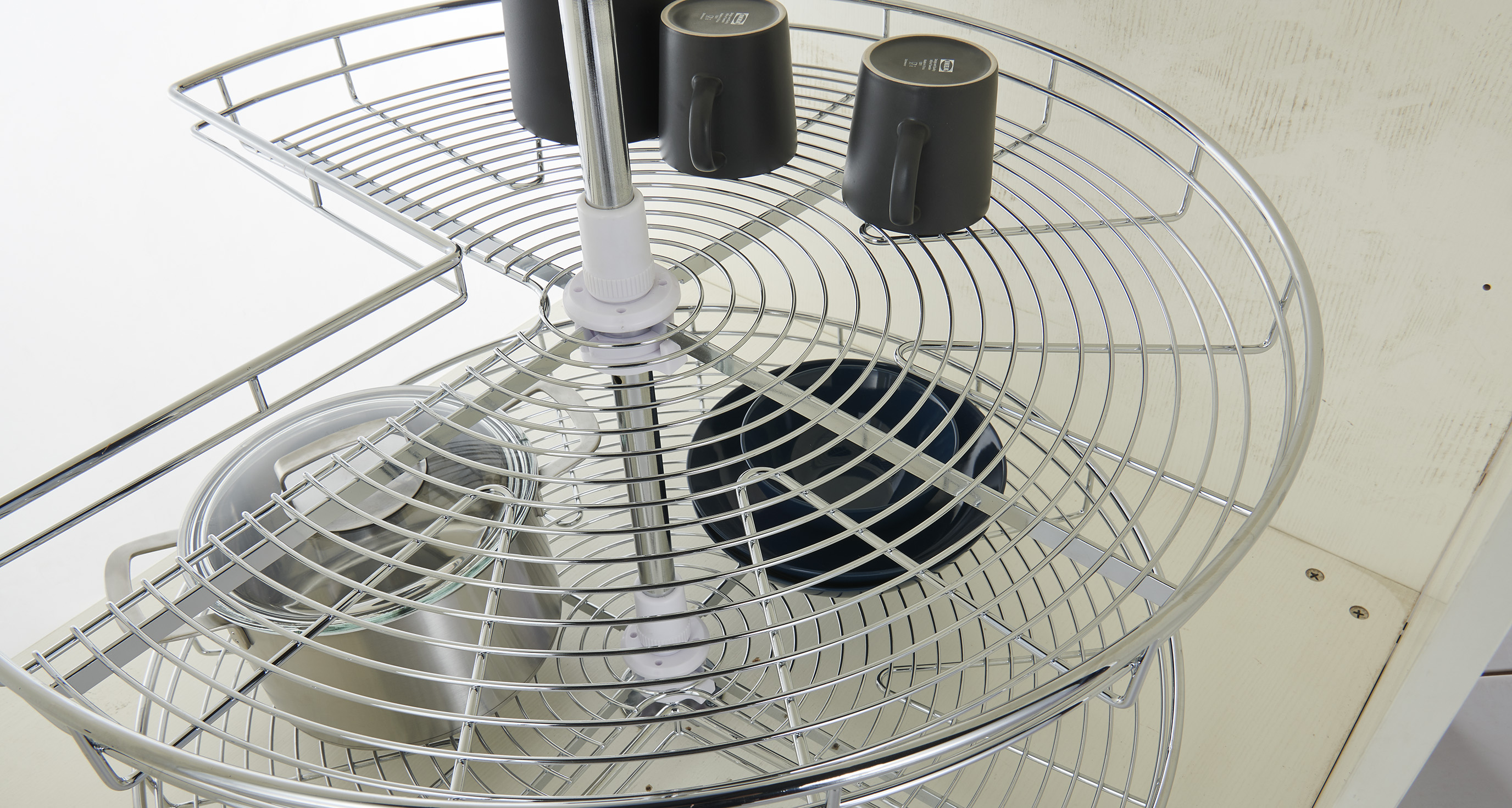 The 270 Degree Swivel Basket is designed to transform hard-to-reach corner cabinets into practical and accessible storage spaces. Featuring a wide rotating angle and kidney-shaped basket structure, this solution provides smoother access and larger storage capacity compared with traditional corner organizers.