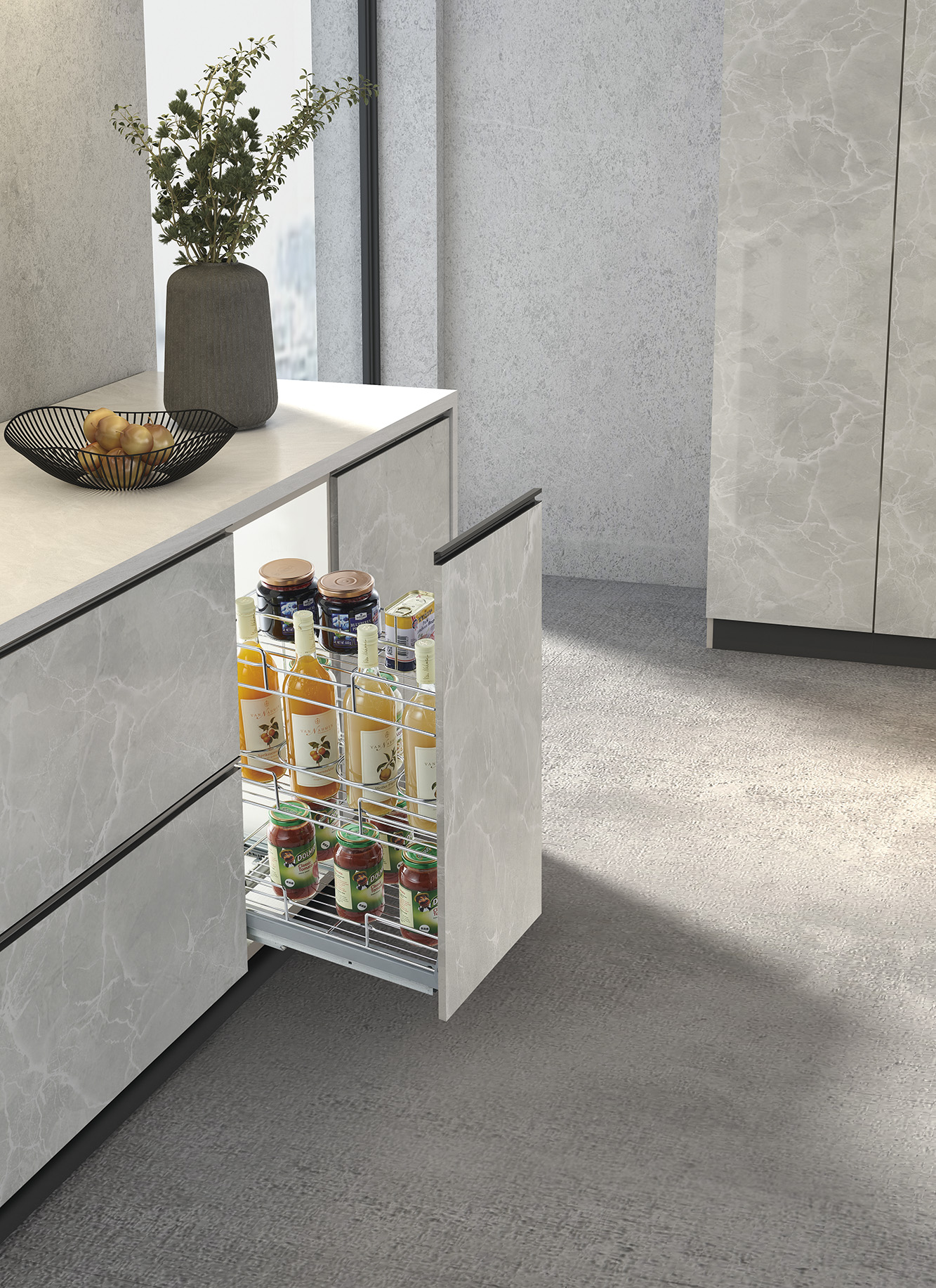 Widely used by cabinet manufacturers as a functional add-on for 300mm cabinet modules. It provides a practical upgrade to standard base cabinets and increases overall storage value in customized kitchen systems.