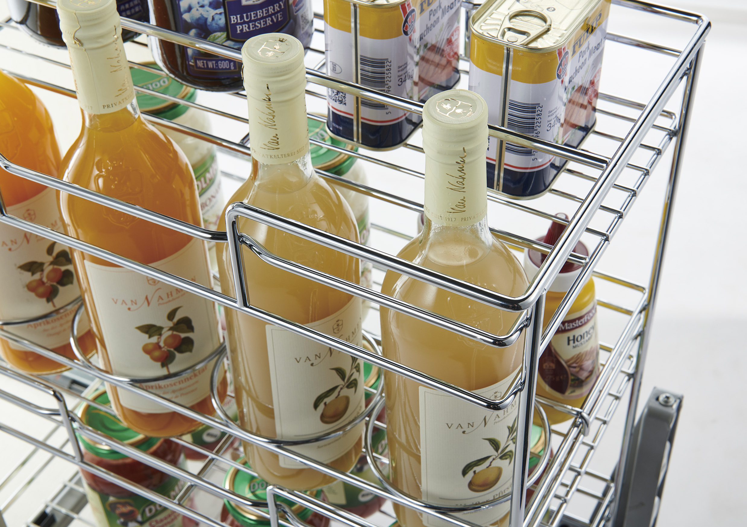 A good option for serviced apartments and hospitality kitchens where organized bottle and jar storage is needed. Smooth pull-out access supports daily cleaning and fast restocking operations.