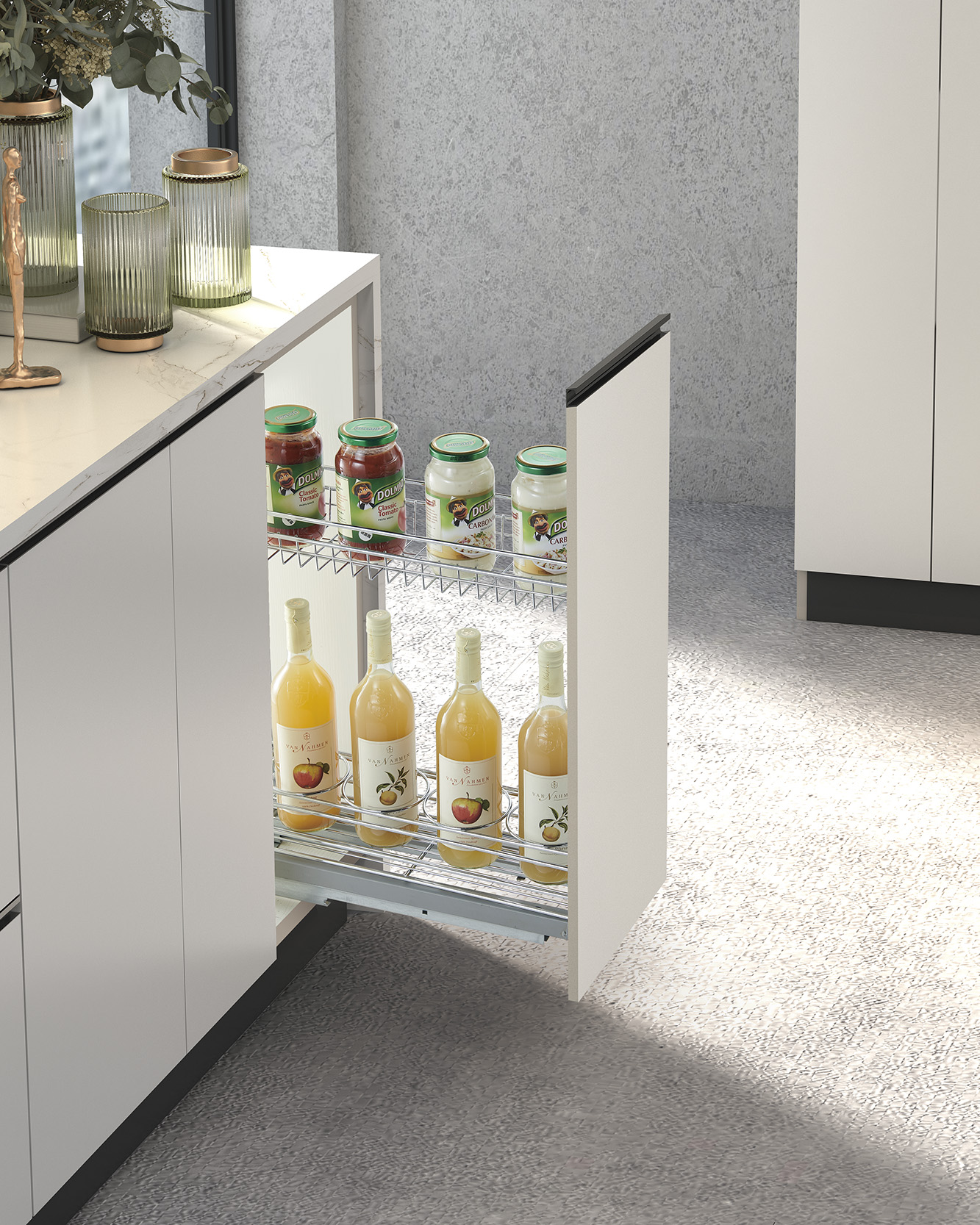 A practical add-on for custom kitchen programs where maximizing storage in narrow cabinet gaps is required.