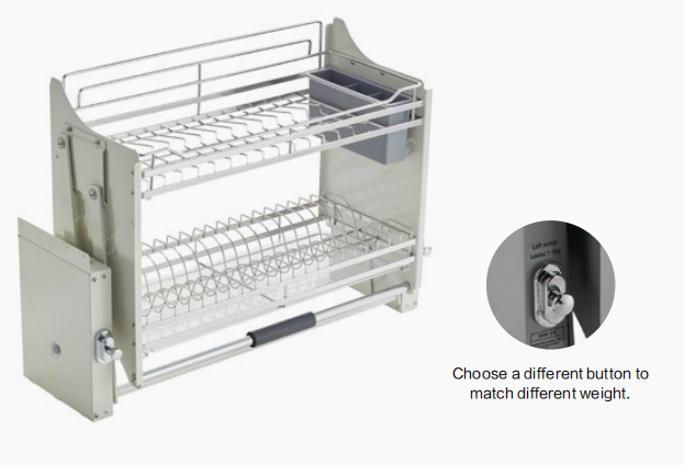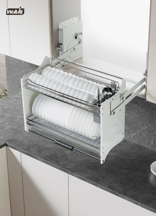 The side cup holder design makes this pull down dish basket especially suitable for modern kitchen cabinets that emphasize functional details. It offers cabinet manufacturers and project planners a differentiated solution compared to standard dish baskets.