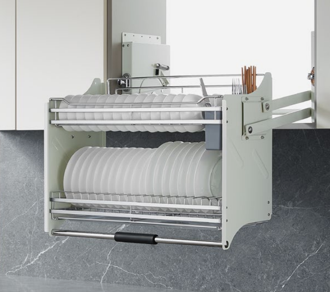 This pull down dish basket features an integrated side cup holder designed specifically for cups, mugs, and small bowls. By separating cups from plates, it improves organization and prevents items from overlapping or colliding during daily use. The side-mounted design makes efficient use of otherwise unused space inside the cabinet.2. Clear Functional Zoning for Plates and Cups