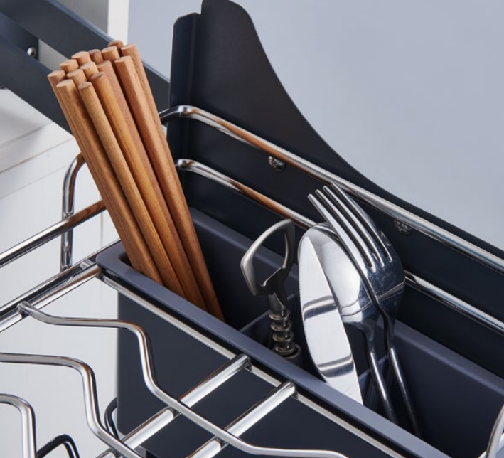 The pull down mechanism allows plates stored at high positions to be lowered to a comfortable working height, reducing overhead reaching and improving daily usability.