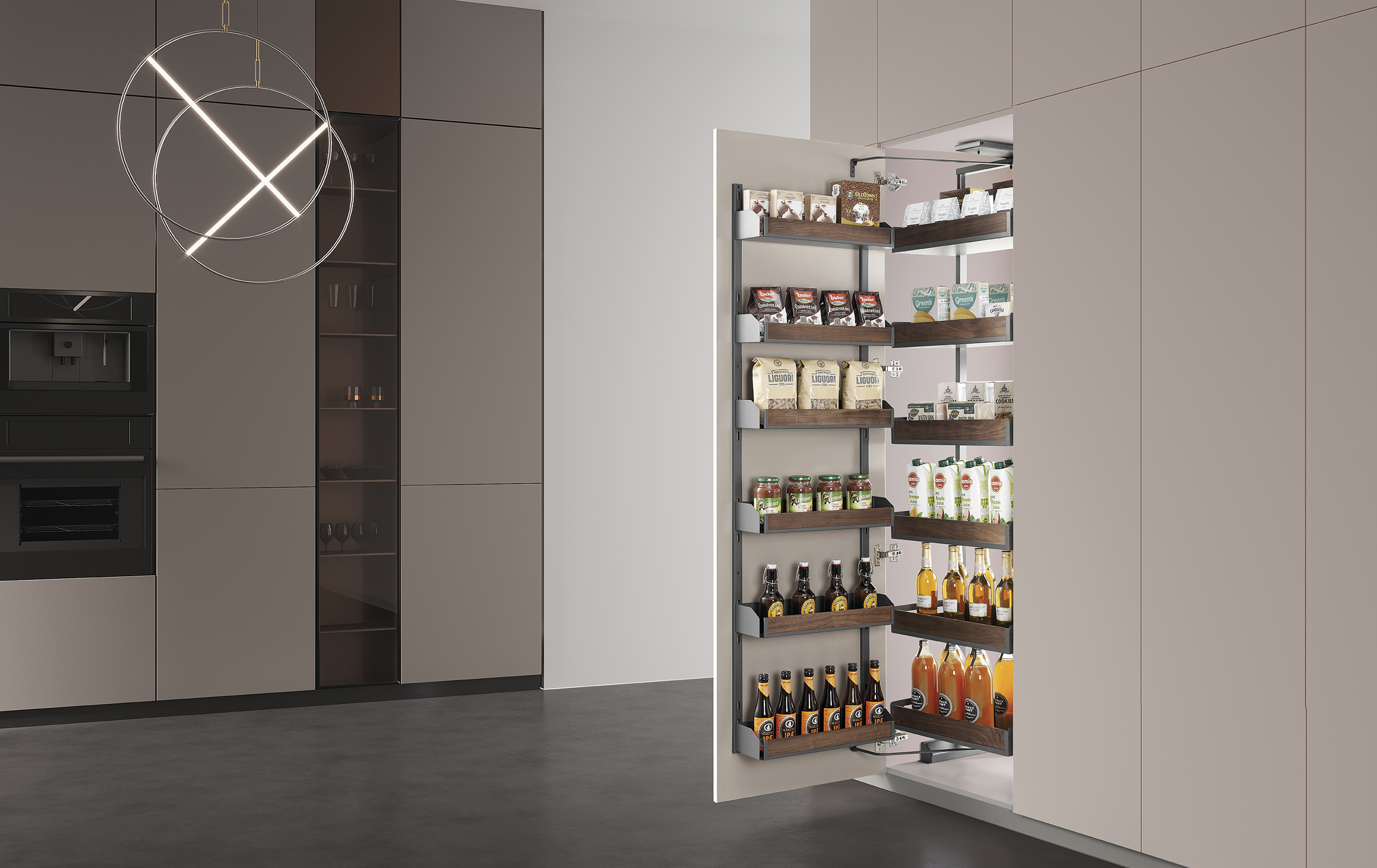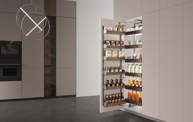 | A673T | Tall pull-out pantry (5-shelf) | D500 × W530 × H(1650–1990) | 600 | 564 | Powder-coated Iron + Walnut/Glass option |