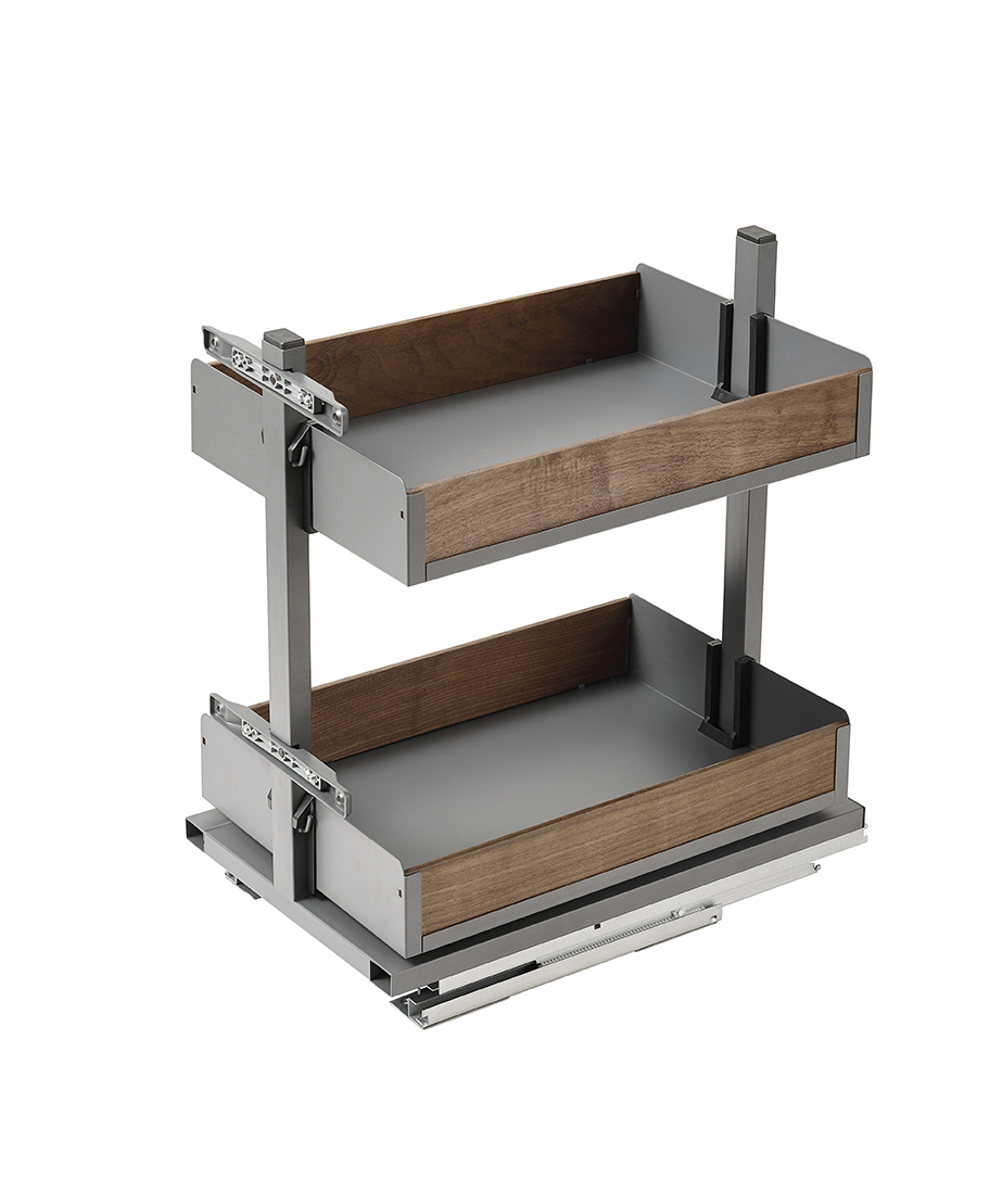 | C230T | 2-shelf drawer basket | D470 × W250 × H515 | 300 | 264 | Walnut + Powder-coated Iron |