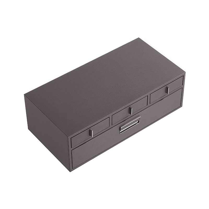 A: The drawer is made from high-quality MDF combined with a durable metal frame, with a leather-textured finish and velvet-lined interior for both strength and elegance.
