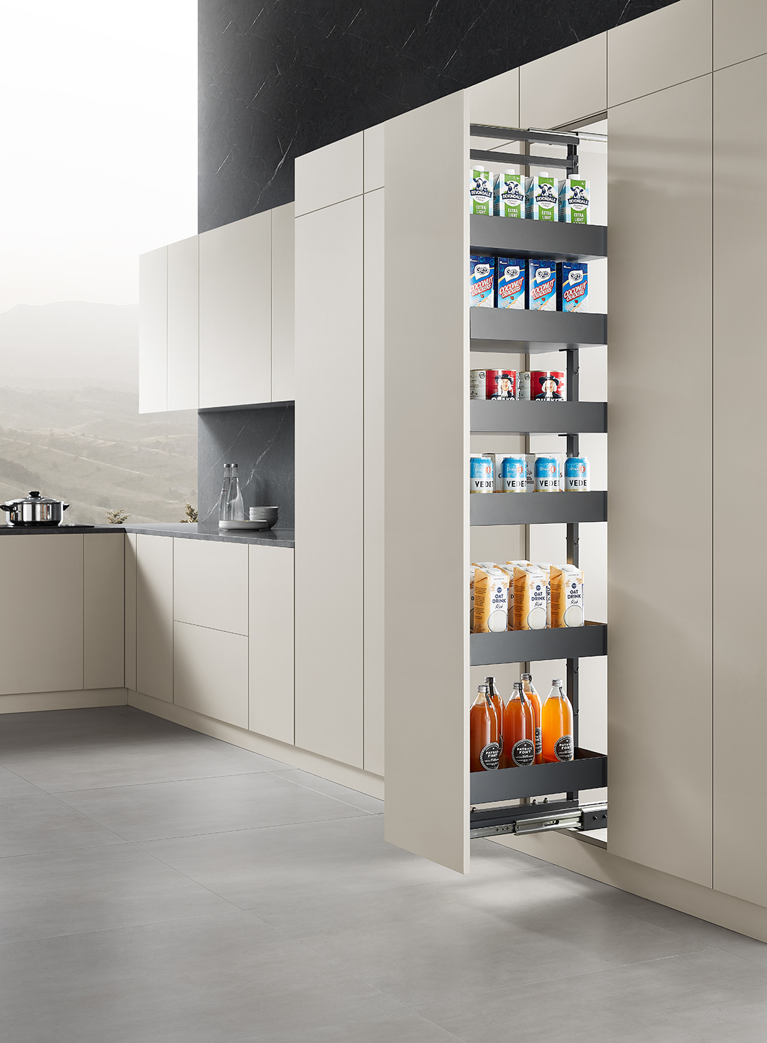 | A841AT3 | Tall larder unit (4-shelf) | D480 × W250 × H (1150–1350) | 300 | 264 | Iron | Powder coated | FULTERER heavy damping slide (Max 120 kg) |