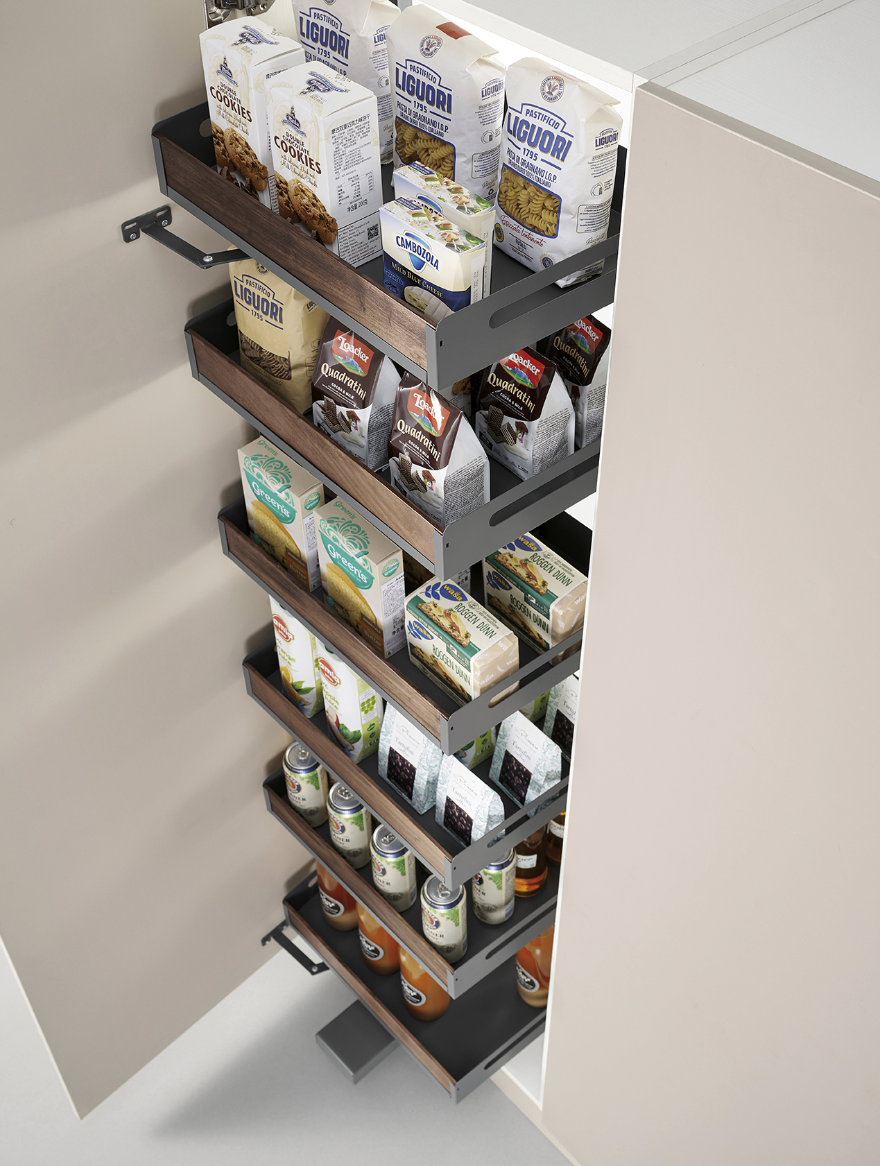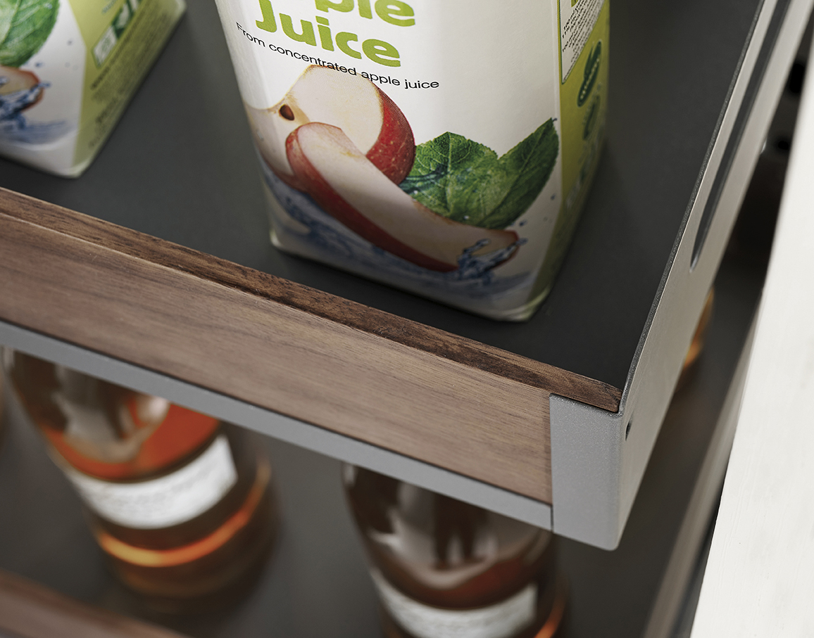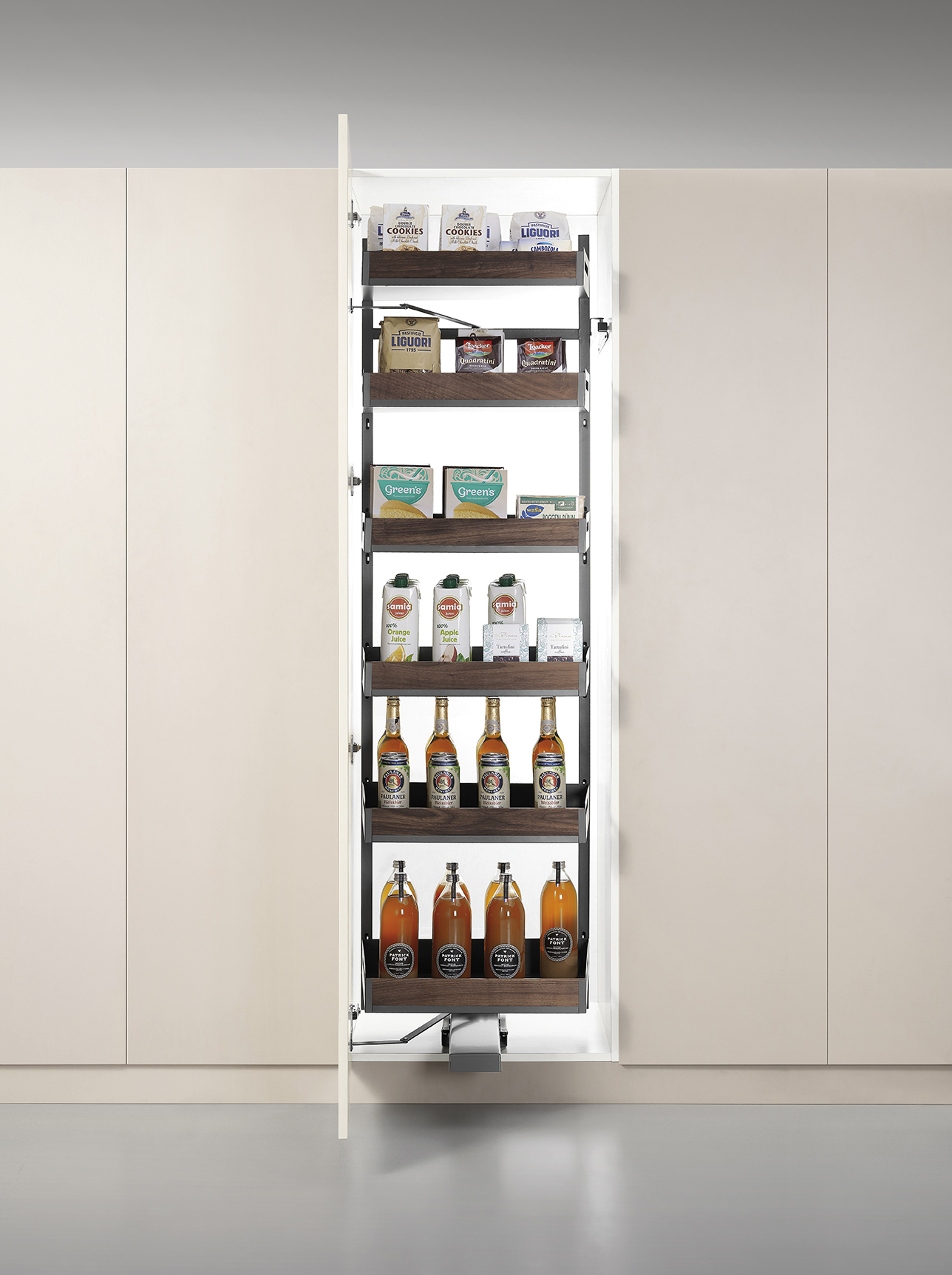 | A650T | Tall pull-out pantry (6-shelf) | D475 × W400 × H1770 | 500 | 464 | Walnut/Glass + Powder-coated Iron |