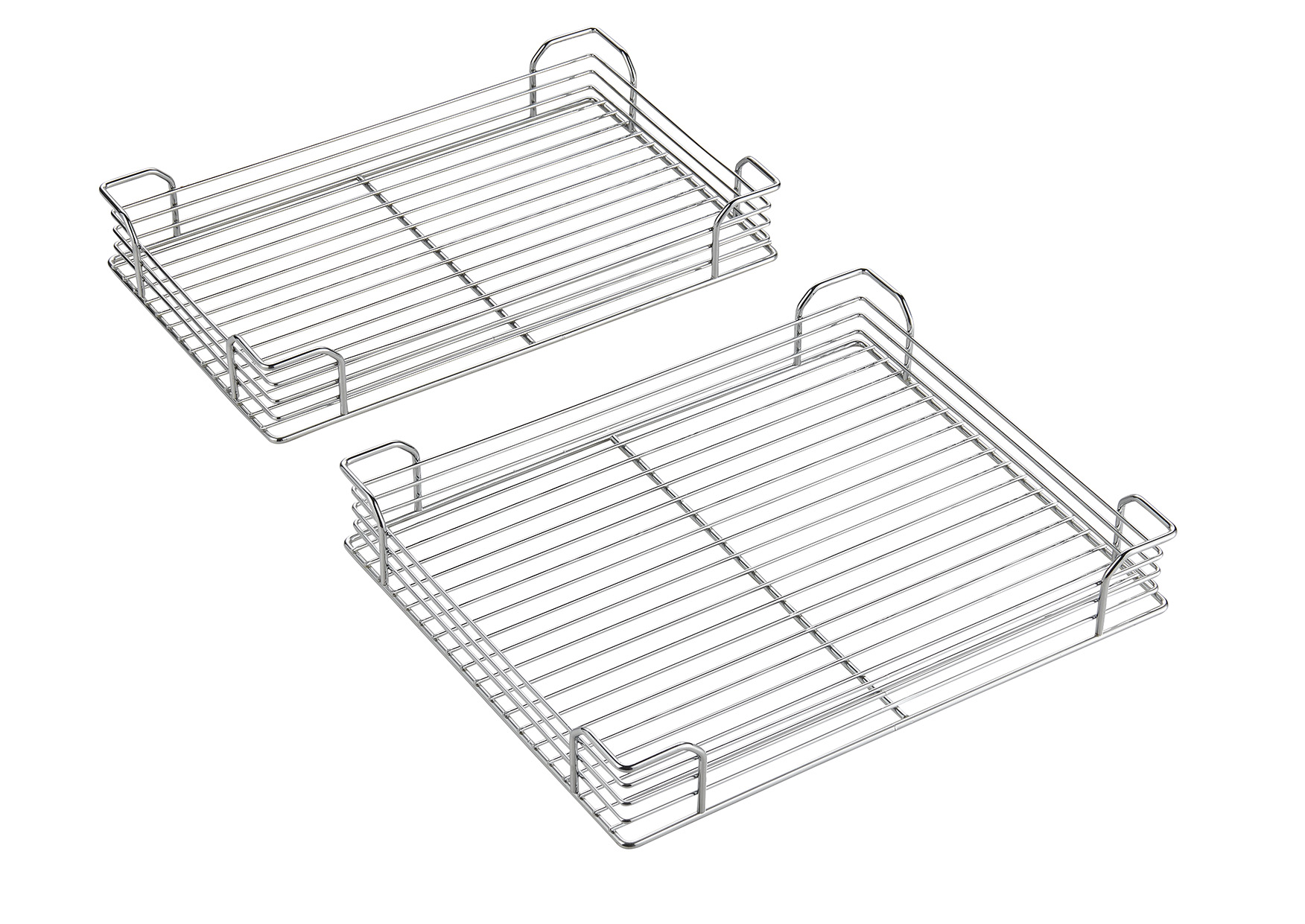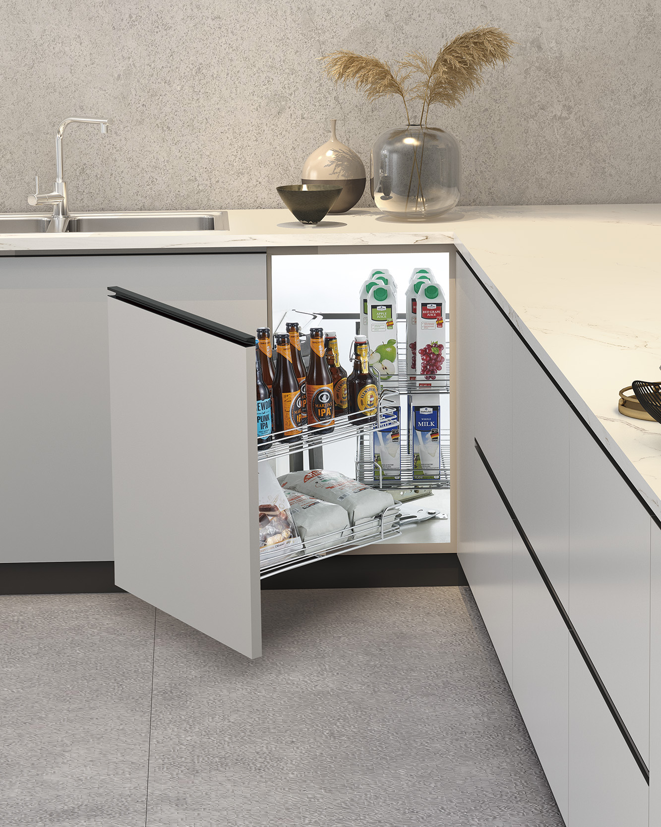 Both trays are linked to the cabinet door, extending outward in a synchronized curve to present all stored items instantly. The raised steel guardrails keep bottles, jars, and cookware secure during movement. This blind corner pull out design ensures no dead corners and allows users to easily organize beverages, dry goods, cookware, and household supplies.