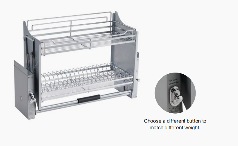 The C series elevator basket is mainly used for storing tableware such as plates, bowls, and daily kitchen items in upper wall cabinets. It is designed to improve accessibility rather than heavy storage.