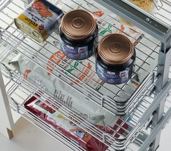 The pull out rack adopts a reinforced metal wire structure with stable welding and firm frame connections to ensure durability in everyday use. Each layer is capable of supporting a considerable amount of weight suitable for kitchen essentials such as jars, condiments, and packaged food. The design has passed multiple pull-and-load endurance tests to ensure reliable performance and long service life. The sturdy yet lightweight structure keeps smooth movement even under a fully loaded condition, maintaining both strength and functionality.