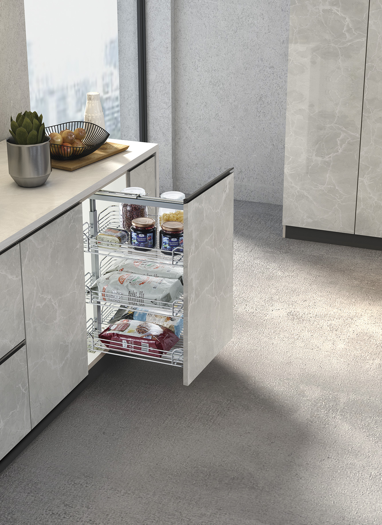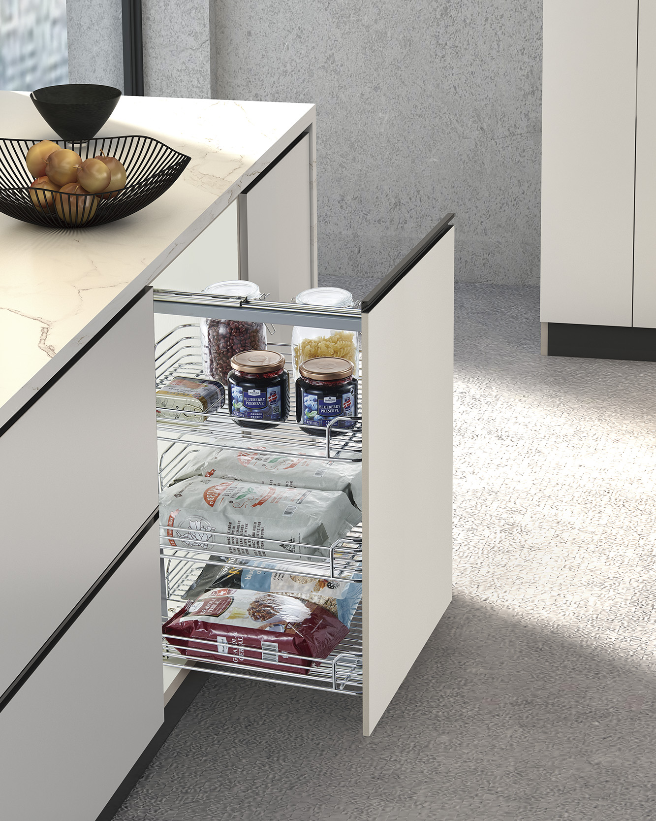 This pull-out kitchen basket is specially designed for 300-450mm base cabinets, maximizing the use of narrow spaces that are often wasted in standard kitchen layouts. It allows users to store spices, bottles, jars and dry food vertically, effectively increasing usable storage by more than 40% compared with traditional drawers. The smmoth slide-out mechanism ensures access to all items, even those placed at the back, without the need to bend or search. A particular and elegant solution that keeps countertops clean and enhances daily cooking efficiency.