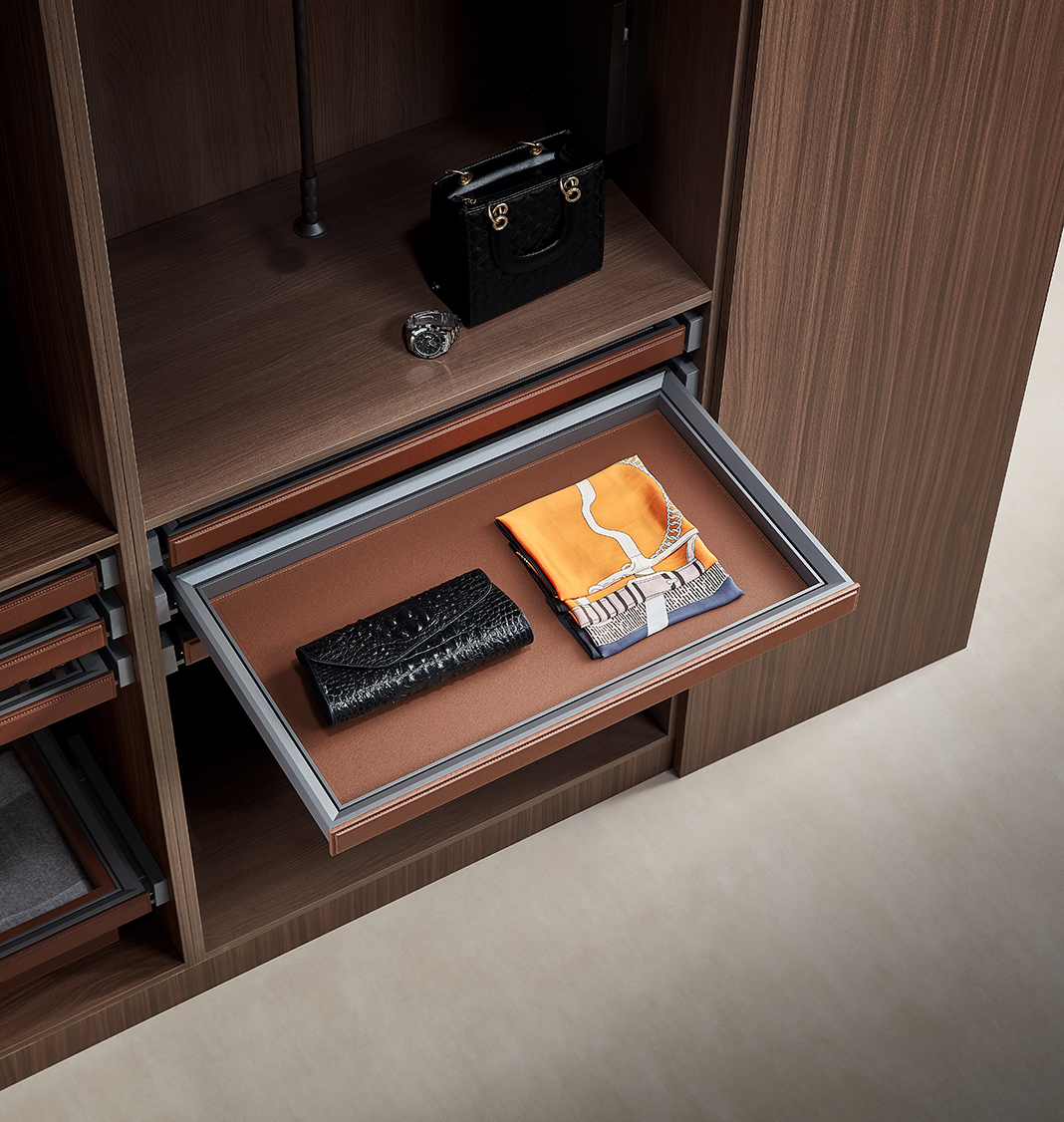 • Wardrobe drawers for organizing accessories, ties, belts, scarves, socks, and underwear.