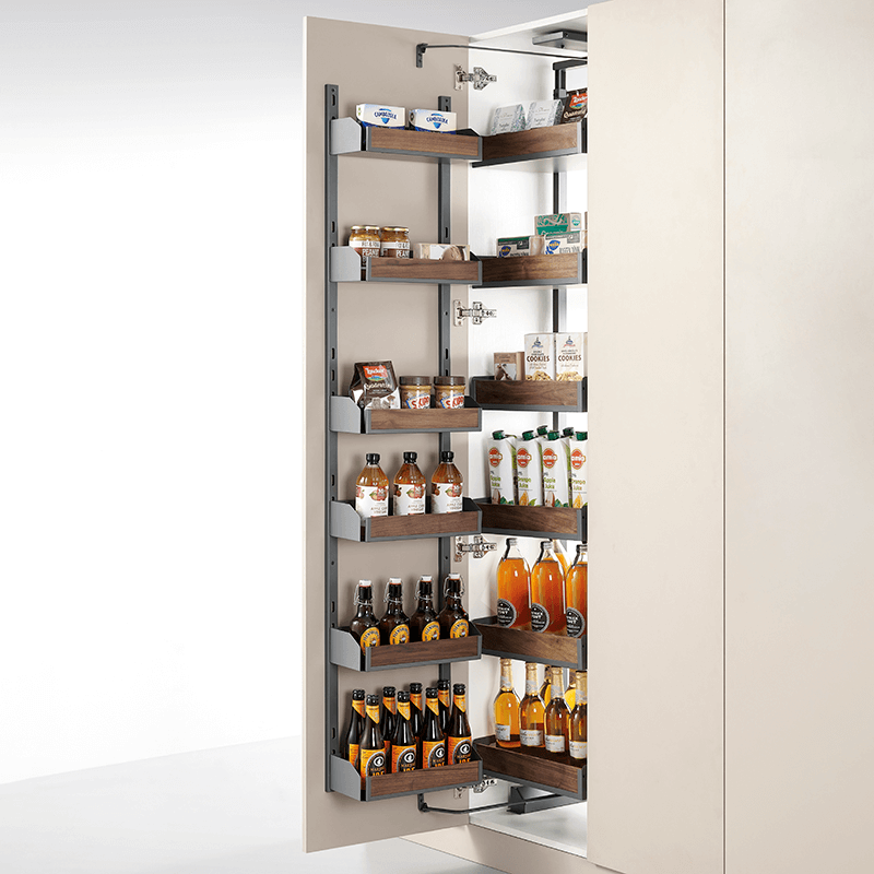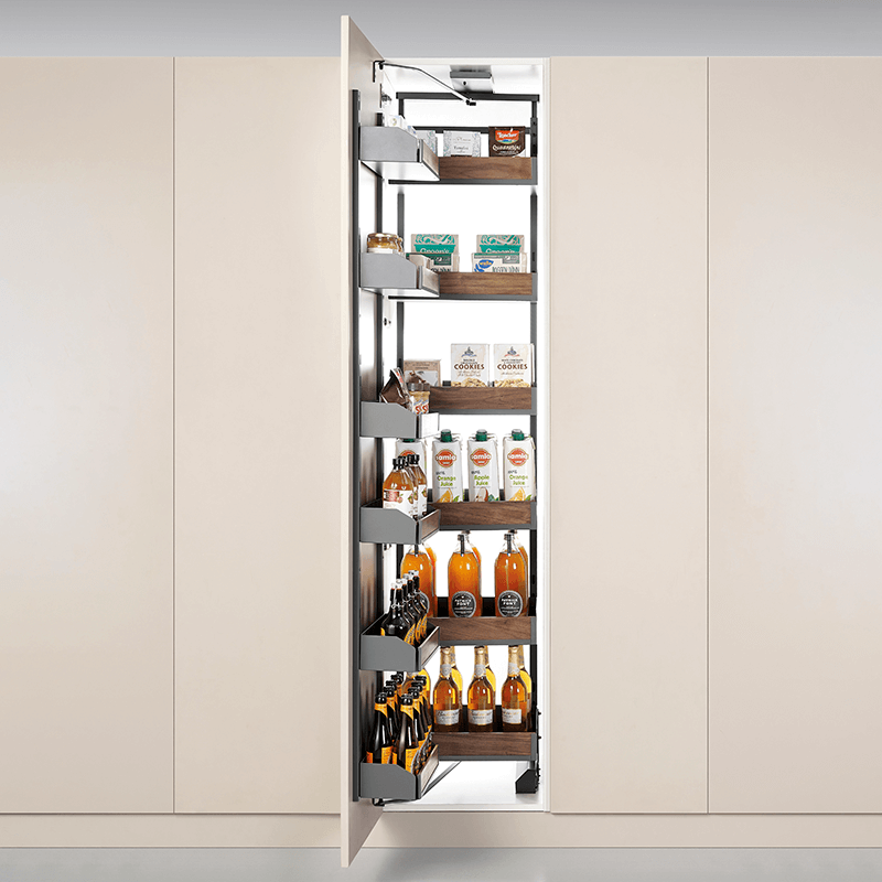 Ideal for modern kitchens with 450mm - width cabinets. The dark - grey metal frame and beech - look baskets match sleek designs. 6 shelves organize dry goods, drinks, and spices, turning cluttered cabinets into a tidy, stylish storage zone that elevates the kitchen's aesthetic.