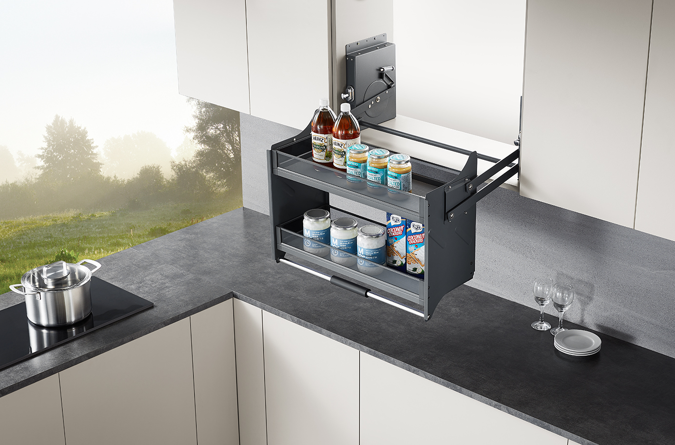 The electric elevator basket system is designed for wall cabinets, providing a practical solution for hard-to-reach storage areas. With a smooth lifting mechanism, users can easily lower and access stored items without effort.