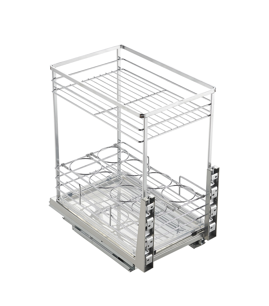 This 2-tier bottle and condiment pull out basket is designed for narrow kitchen cabinets, offering organized storage for bottles, jars, sauces and pantry essentials. Featuring upper shelf storage and lower bottle holder rings, it keeps tall bottles stable during sliding while maximizing cabinet space. Equipped with soft close slides and durable wire construction, it is an ideal solution for modern kitchen storage projects.