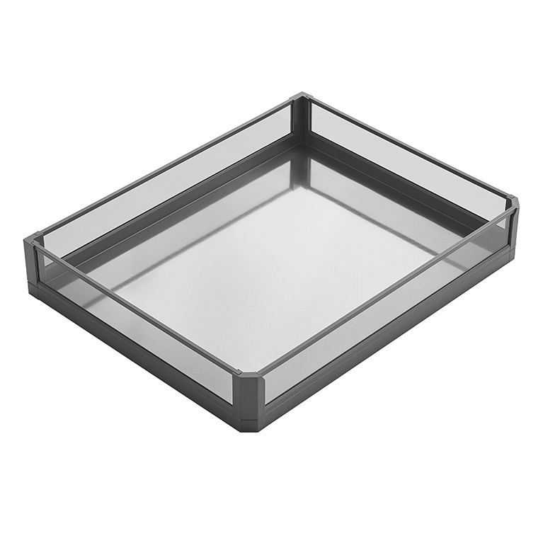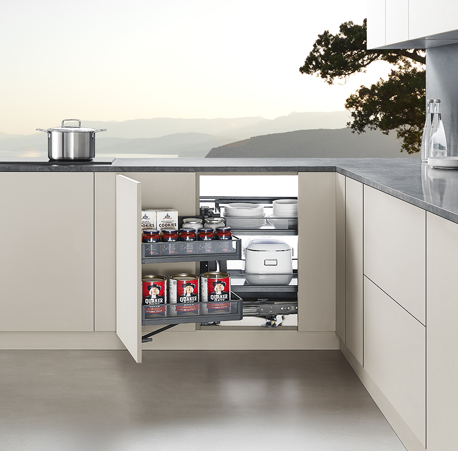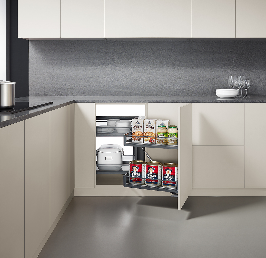 This grey glass magic corner system is designed to solve blind corner cabinet problems and maximize kitchen storage space. It allows easy access to deep corner areas while maintaining a modern and premium kitchen appearance.Smooth pull-out system for easy access