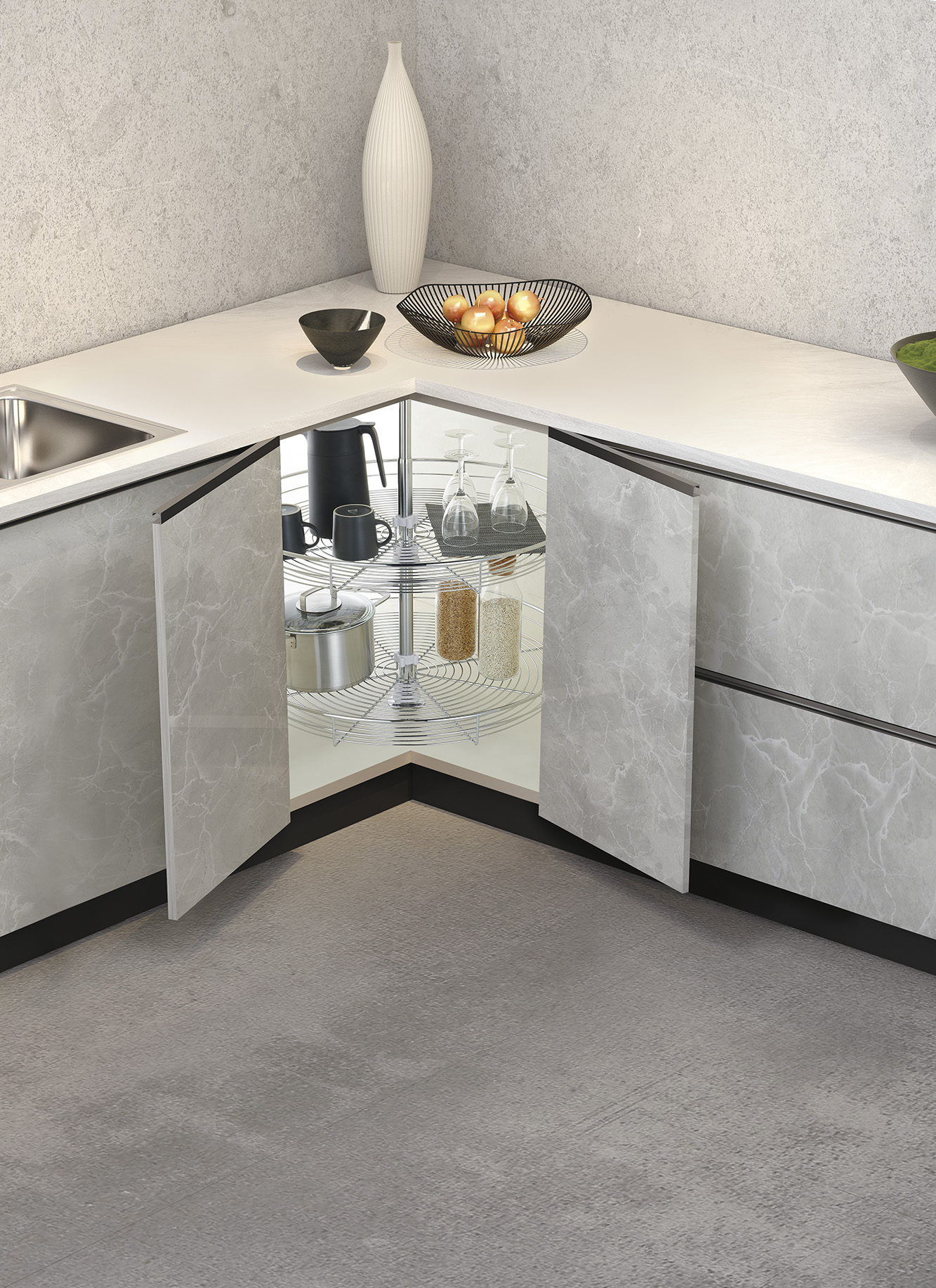 Suitable for cookware, dishes, dry goods and daily kitchen essentials, this rotating system turns unused corner space into highly practical storage.