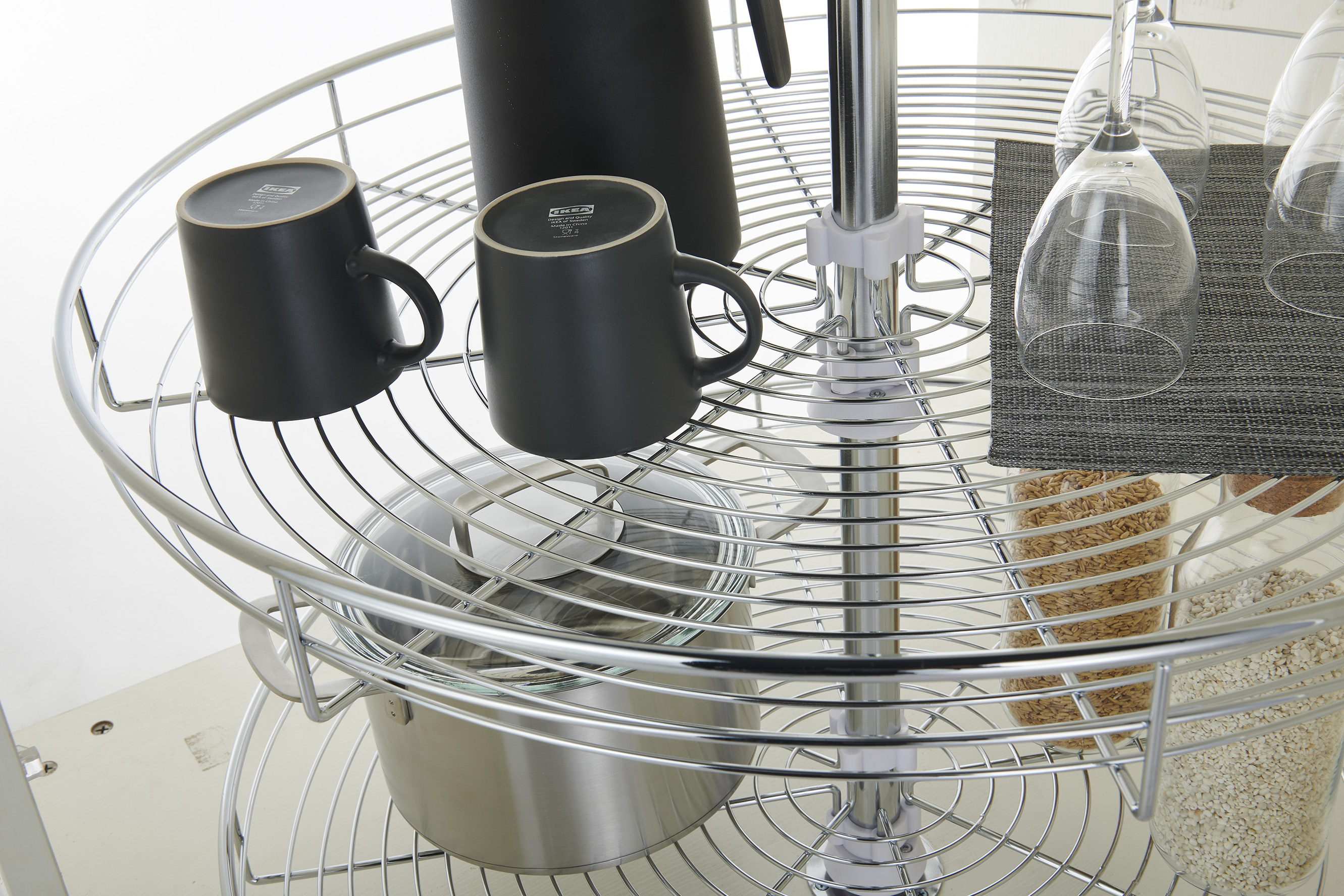 The circular basket design makes full use of corner cabinet space that often goes unused.