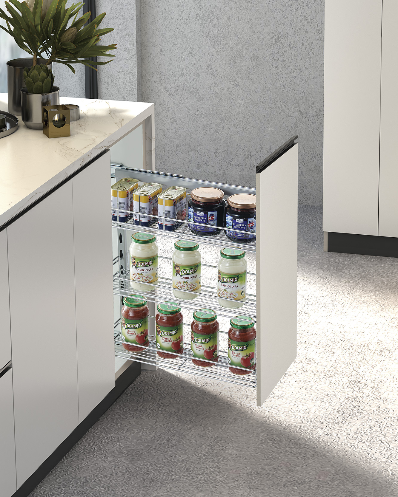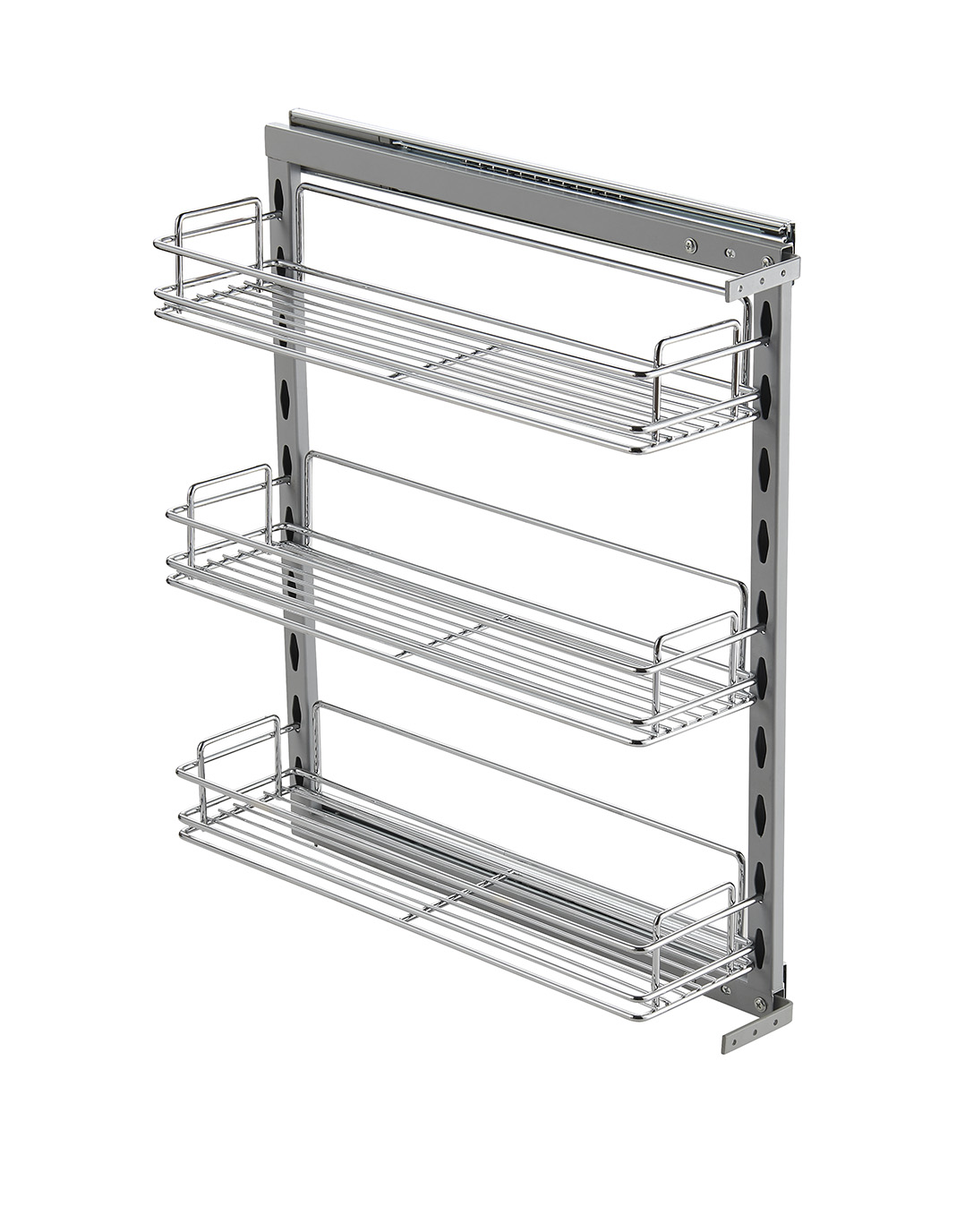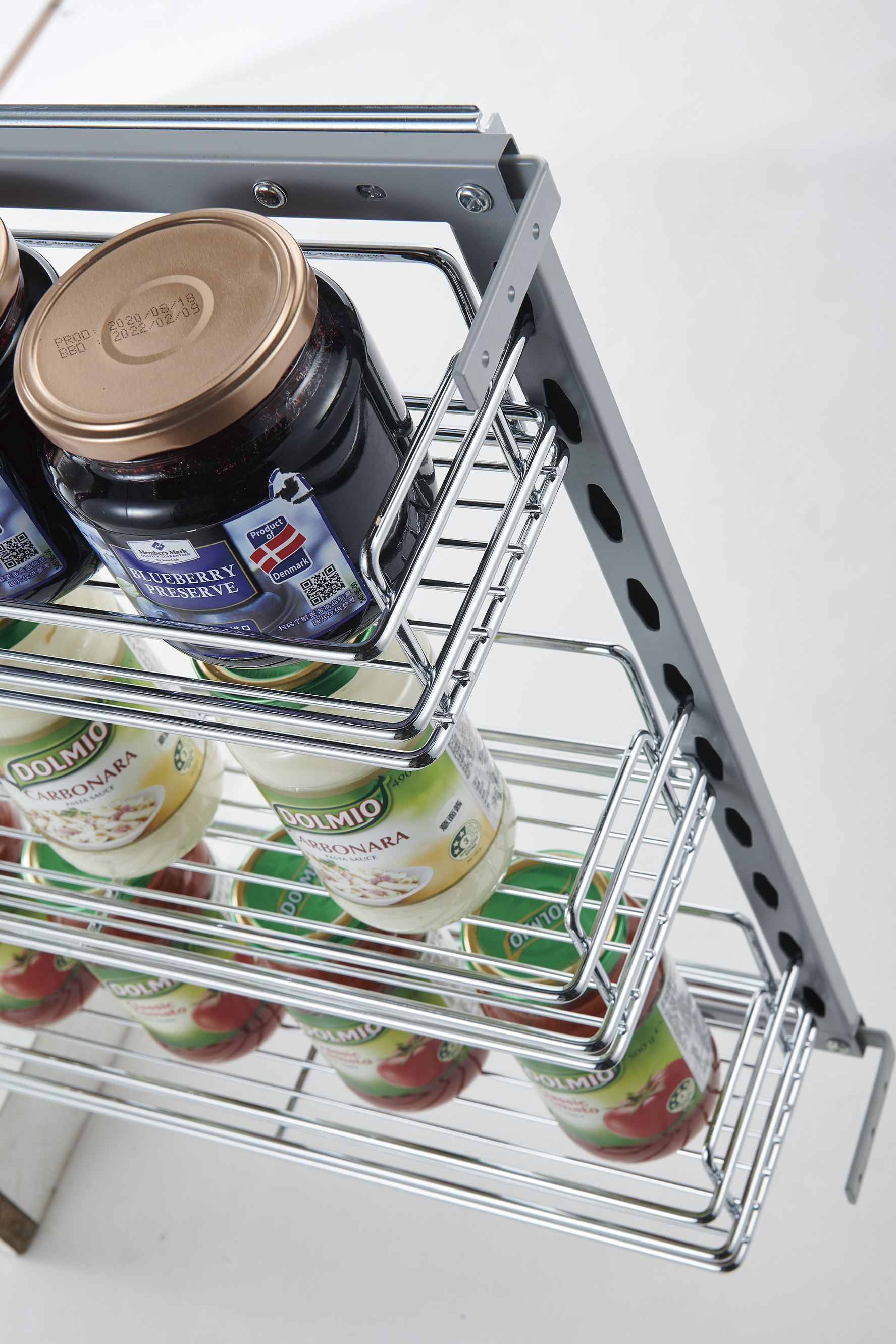 The Tall Narrow Pull Out Pantry Basket is designed to maximize vertical storage in slim cabinets through a multi-tier pull out system. Unlike standard side pull out spice baskets, this solution offers greater storage capacity and organized pantry-style access for bottles, jars and packaged goods.